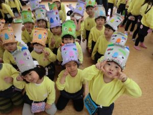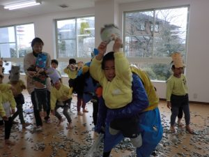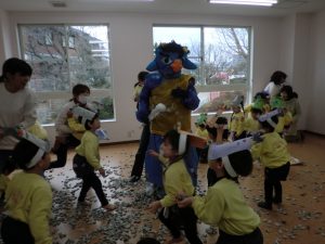 皆で集まって、豆まきの紙芝居を読んだり、お歌をうたったりしました
