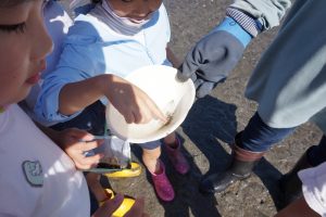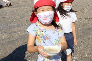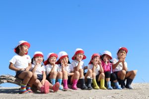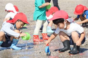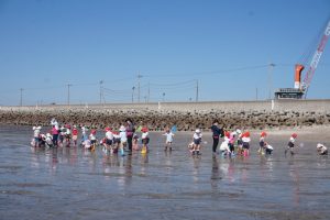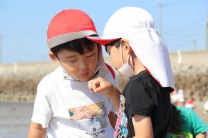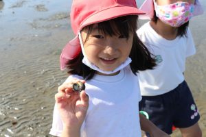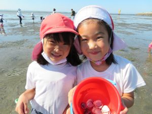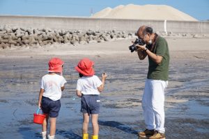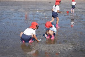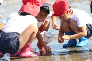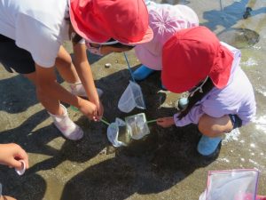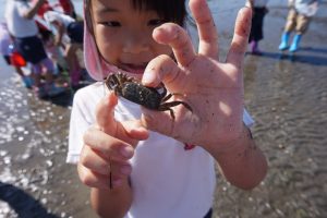 みんな貝を拾ったり、残った水を泳ぐ魚を観察したり、カニを捕まえたり、潮干狩りしたり・・・