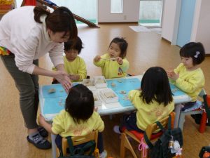 おもちつきの歌の『鏡餅』や『伸餅』の歌詞を『あんこもち』『しょうゆもち』『いちご餅』『チョコ餅』など色んなお持ちの名前に変えて歌いながら、「うわぁ~それおいしそうやね~」と子どもたち同士で盛り上がっていました![]()
