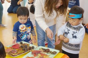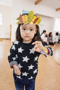 赤や黄色、緑や茶色などいろんな色の葉っぱや、どんぐり、松ぼっくり、木の実や種などいろんな材料を準備して冠とブレスレットを作りました