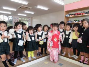 金曜日に七五三に行ったあおぐみさんとももぐみさんの姉妹が、幼稚園に見せに来てくれました![]()