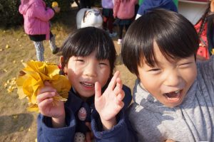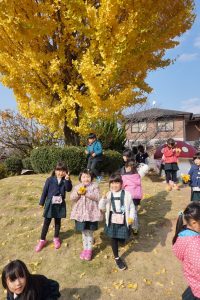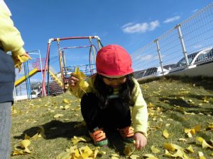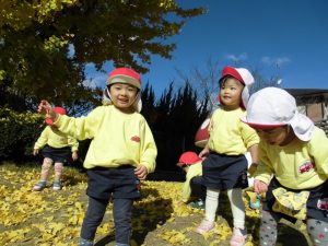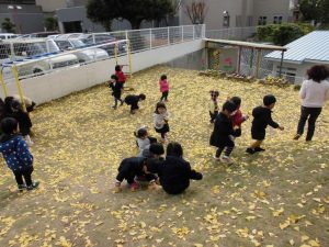 最近の子どもたちの楽しみはイチョウのじゅうたんでゴロゴロしたり、パァァっと撒いたり、イチョウでバラの花束を作ったり、この時期だからこそ、この時期だけしか楽しめない遊びを満喫しています![]()