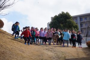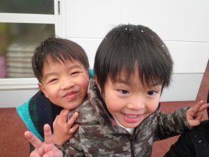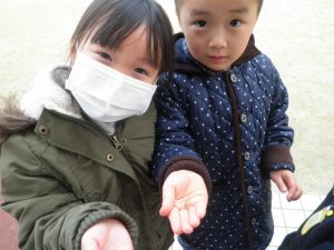 なかなか積もるまではなくて、降ってくる雪を触ったり、捕まえたり、凍った地面の氷を掴んでみたりして遊びました![]()