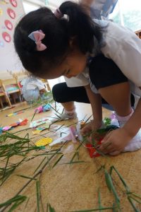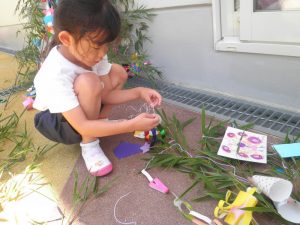 そして、園長先生たちが取ってきてくれた笹のはに自分たちが作った七夕飾りを飾って持ち帰りました![]()
