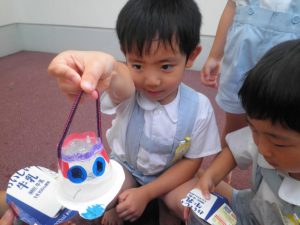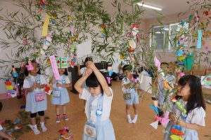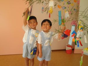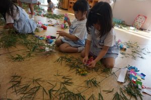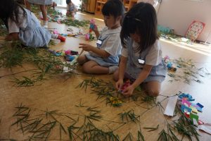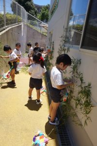 そして、園長先生たちが取ってきてくれた笹のはに自分たちが作った七夕飾りを飾って持ち帰りました![]()