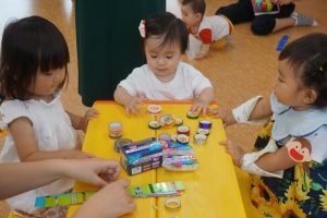 作ったもので遊べる時間をと思っていたのですが、みなさんとても熱心に作ってきただき、とても賑やかでかわいらしい作品が出来上がりました![]()