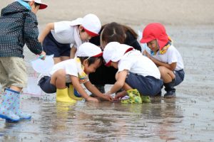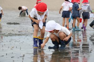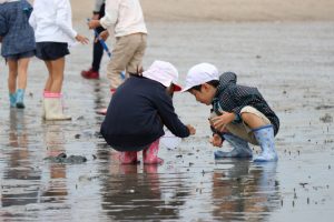 潮が引いてさほど時間が経っていないのか、まだ砂浜に水分があり、貝以外にもカニやエビがたくさんいました