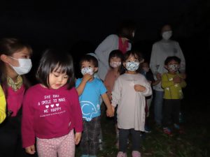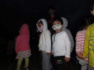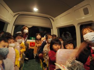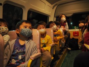 一度帰ってからの集合、暗くなってからのバス、園外保育…と子どもたちはワクワクで、バスの中でもハイテンションでした