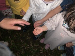 きぐみさんが「おーい!こっちにおいでー!」というと、遠くで光っていた蛍が近づいてきてくれ大喜び