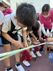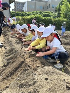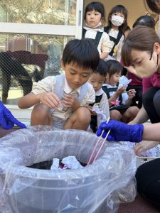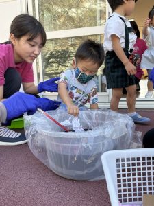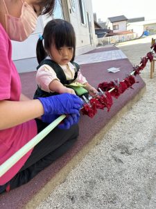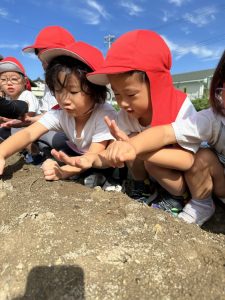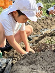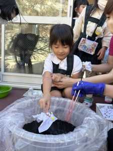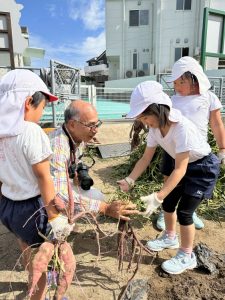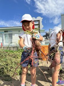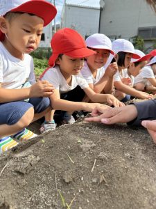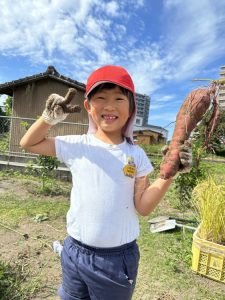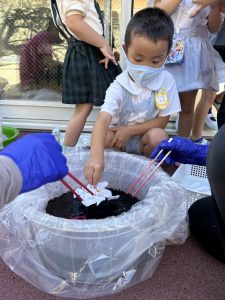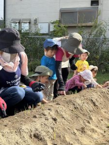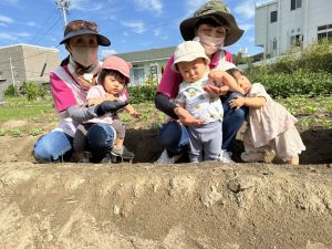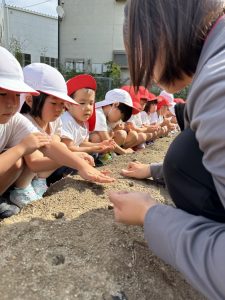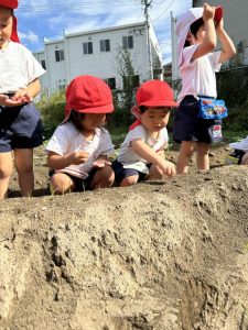 さて、今週は造形教室で染め物をしたり、人参・大根の種を蒔いたり、あおぐみさんは芋掘りをしたり、お外でたーくさん遊んだりして過ごしました。