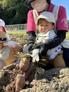 サツマイモは、ジャガイモのように子どもの手で…ということにはならないので、一回先生がショベルで掘り起こしてから子どもたちに引っ張ってもらいました✨