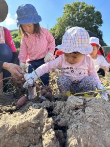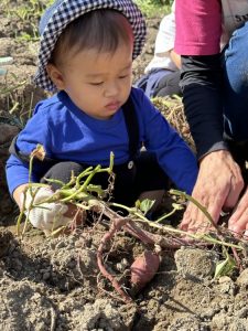 サツマイモは、ジャガイモのように子どもの手で…ということにはならないので、一回先生がショベルで掘り起こしてから子どもたちに引っ張ってもらいました✨