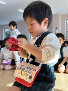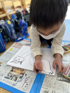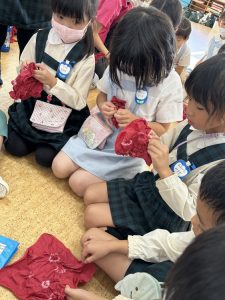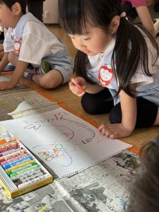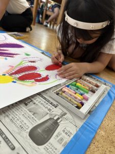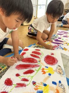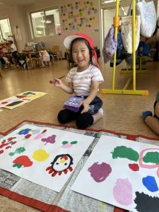 今週はお芋掘りをしたり、絵を描いたり、お外でドッチボールをしたり、大縄したり、造形では染め物の輪ゴムを外して模様を見たりしました!!