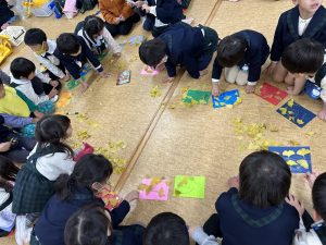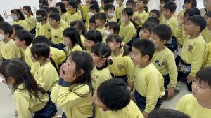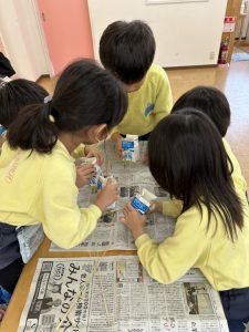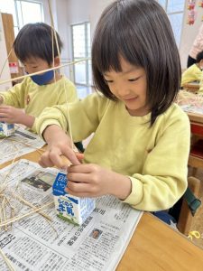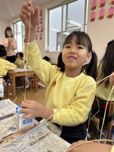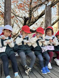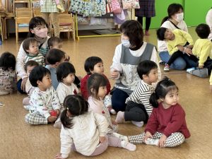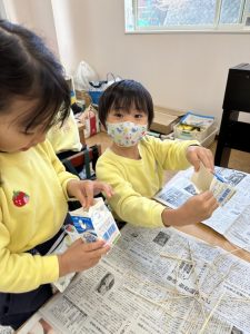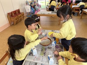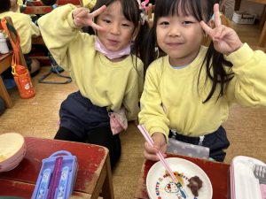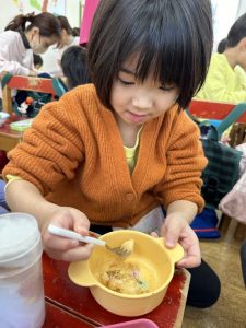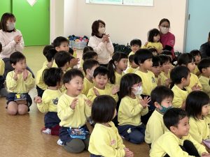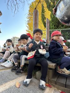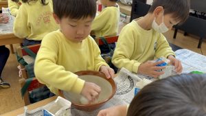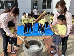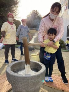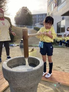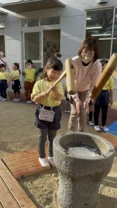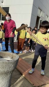大きな掛け声と共に力強い餅つきを見せてくれました。杵がおもくて、なかなか思うように持ち上がらなかったり、もっちもちのお餅に杵を取られてしまって振りかぶらなかったり…という子もいましたが、みんなが元気いっぱい応援してくれました✨