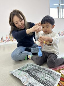 そして、寒い雪の中、さくらんぼのお友だちも遊びに来てくれましたよ!みんなで小麦粉を使って、風船スクイーズを作りました✨
