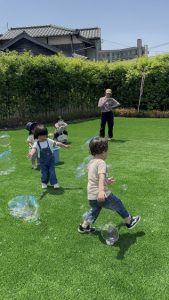 お母さん方も楽しんで頂けたようで、みんなで大きなシャボン玉を追いかけたり、作るのに挑戦してみたり、楽しかったですね