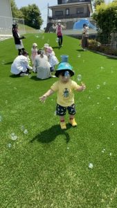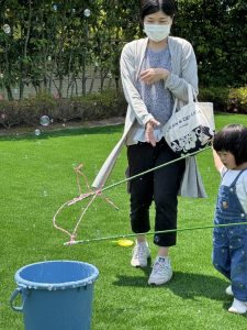 お母さん方も楽しんで頂けたようで、みんなで大きなシャボン玉を追いかけたり、作るのに挑戦してみたり、楽しかったですね