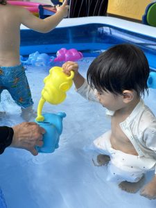 そしてお盆が明けると、まだ暑さは残っていますが、少し風が涼しく、日差しも少し和らいできたように感じられるようになり、熱中症警戒アラートにより足だけの水遊びや、中止していた水遊びも、今週は水着に着替えてプールをためて、水風船で遊びながら楽しめるようになりましたね✨