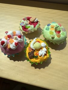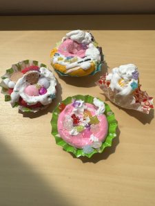 パティシエのように真剣な面持ちで、ホイップ粘土を絞ったり、フルーツやチョコ、クッキーなどをのせて飾りつけ♡