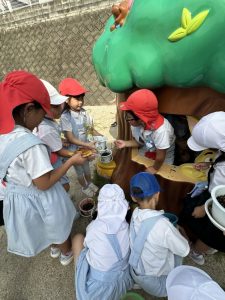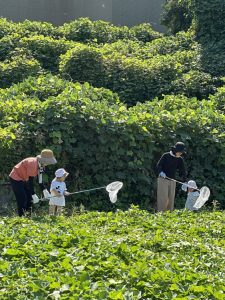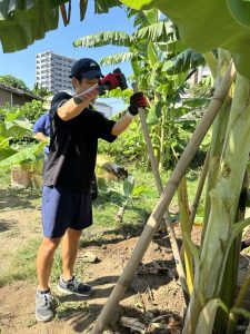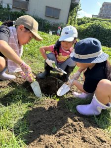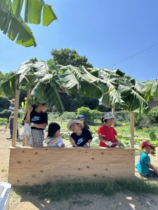とっても良いお天気で、子どもたちは虫取りをしたり、畑を走り回ったり、株分けする穴を掘ったり、バナナ小屋を作ってお店屋さんごっこをして遊んだりしました🎵