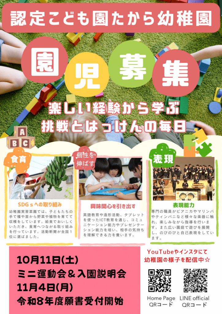 お問い合わせや予約は認定こども園たから幼稚園のLINE公式アカウントで受け付けております。QRコードから友だち登録してお気軽にお問い合わせください!